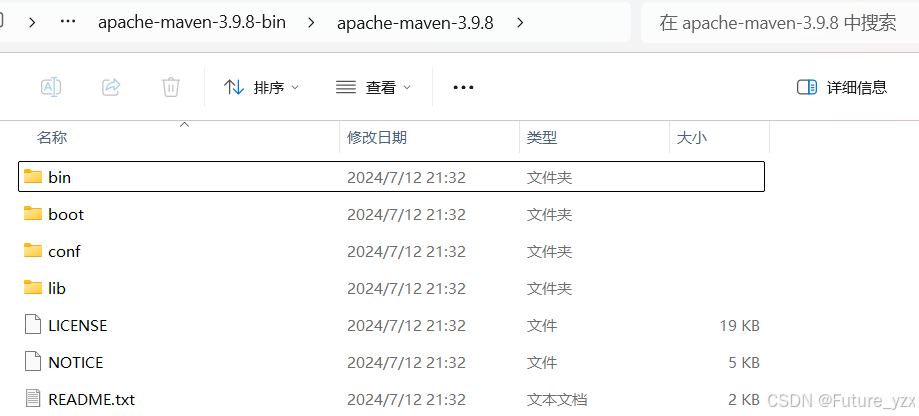 #### 4.Maven的作用: * 项目构建:Maven为我们提供标准的、跨平台的自动化项目构建方式; (之前我们创建项目,需要确定项目的目录结构,比如src 存放Java源码, resources存放配置文件,webContent放前端页面,还要配置环境比如JDK的版本等等,如果有多个项目 那么就需要每次自己搞一套配置,十分麻烦。Maven为我们提供了一个标准化的Java项目结构,我们可以通过Maven快速创建一个标准的Java项目.) * 依赖管理:通过Maven,可以方便快捷的项目依赖的资源(jar包),避免资源的版本冲突问题。 * 统一开发结构:提供了一套标准的、统一的项目结构(自从用了Maven写Java项目,大家都按照它建议的项目结构来写) ### 三、Maven的下载、安装与配置(windows版本) #### 1.下载与安装 ①首先去Maven官网:[Maven – Download Apache Maven](http://maven.apache.org/download.cgi "Maven – Download Apache Maven")  ②当前Maven最新版本为3.9.8,下载完后是一个压缩包;Maven是绿色软件,解压及安装; 注意:我们要找一个没有中文没有空格的路径下进行解压安装。例如我的是在D:\\Program Files\\Maven\\apache-maven\-3.9.8 ③解压完的Maven目录如下:  * **bin文件夹:**该文件中包含的是mvn的运行脚本,我们在命令行中使用mvn语言实际上就是在调用该文件夹中的脚本,比如mvn -v。这里面的脚本分为mvn和mvn.bat。前者是用在Unix系统,后者是用在windows系统上。 * **boot文件夹:**该目录只包含一个文件:plexus-classworlds-XXX.jar。该jar文件是一个类加载器框架,相对于默认的Java类加载器,他提供了更丰富的语法以方便配置。Maven使用这个框架来加载自己的类库。 * **conf文件夹:**这里面存放的是Maven的配置文件,其中有一个非常重要的文件是setting.xml,修改这个文件可以对Maven进行全局的修改。(后面会用到) * **lib文件夹:**这里面包含了Maven本身运行时所需要的所有Java类库(jar包)。这里面算是真正的Maven代码,是Maven的核心部分。Maven本身是分模块开发的,所以用户可以看到诸如maven-core-3.1.jar、maven-model-3.1.jar之类的文件。另外,这个文件夹还含有一些Maven用到的第三方依赖。 #### 2.配置Maven的环境变量 ①在windows搜索框搜索环境变量 ——>打开编辑系统环境变量——>点击环境变量(N)——>点击新建(N)    **③**新建一个MAVEN\_HOME变量   ⑥点击新建后;在输入框中输入%MAVEN\_HOME%bin ;表示将刚刚创建的MAVEN\_HOME环境变量添加到系统Path下;一定注意前后加上“%”,结尾加上bin(指定到bin目录下) ⑦配置完上面的一切后;最后win+R打开命令窗口:输入mvn -v检查Maven是否安装且配置成功,若出现下图样子,恭喜你,成功安装上了Maven。  #### 3.配置Maven的本地仓库(本地仓库就是用来存储jar包的一个文件夹) ①maven的本地仓库默认是在 C盘 .m2 目录下,但是将本地仓库放在C盘会占用c盘空间,所以这里要重新配置一下. ②打开maven的安装目录中,进入 conf文件夹, 找到 settings.xml 文件, 上文有提到过,这个文件是Maven的一个重要的配置文件,修改这个文件可以对Maven进行全局的修改。   ③用你的一个可靠的IDE打开setting文件夹,例如VScode或IDEA,这里我用VScode打开的: