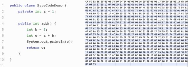 # 1.字节码 ## 1.1 什么是字节码? Java之所以可以“一次编译,到处运行”,一是因为JVM针对各种操作系统、平台都进行了定制,二是因为无论在什么平台,都可以编译生成固定格式的字节码(.class文件)供JVM使用。因此,也可以看出字节码对于Java生态的重要性。之所以被称之为字节码,是因为字节码文件由十六进制值组成,而JVM以两个十六进制值为一组,即以字节为单位进行读取。在Java中一般是用javac命令编译源代码为字节码文件,一个.java文件从编译到运行的示例如图1所示。