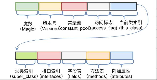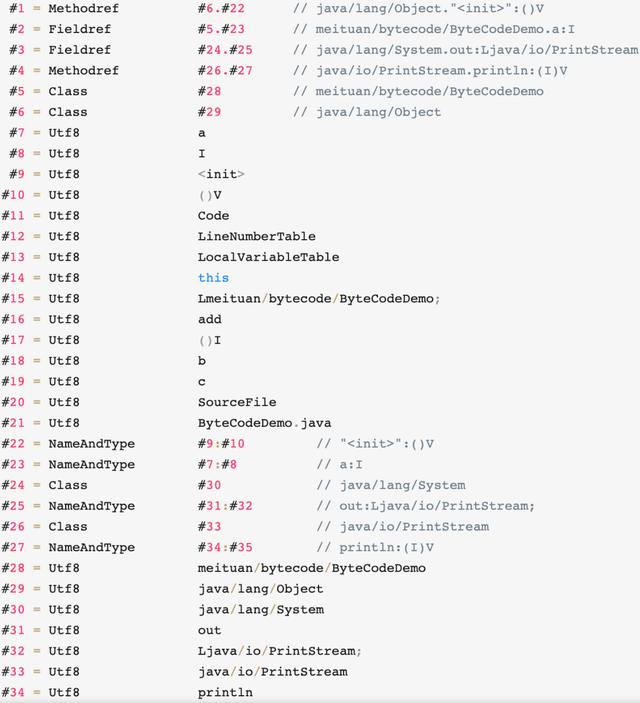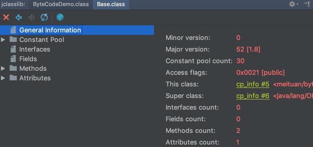 对于开发人员,了解字节码可以更准确、直观地理解Java语言中更深层次的东西,比如通过字节码,可以很直观地看到Volatile关键字如何在字节码上生效。另外,字节码增强技术在Spring AOP、各种ORM框架、热部署中的应用屡见不鲜,深入理解其原理对于我们来说大有裨益。除此之外,由于JVM规范的存在,只要最终可以生成符合规范的字节码就可以在JVM上运行,因此这就给了各种运行在JVM上的语言(如Scala、Groovy、Kotlin)一种契机,可以扩展Java所没有的特性或者实现各种语法糖。理解字节码后再学习这些语言,可以“逆流而上”,从字节码视角看它的设计思路,学习起来也“易如反掌”。 本文重点着眼于字节码增强技术,从字节码开始逐层向上,由JVM字节码操作集合到Java中操作字节码的框架,再到我们熟悉的各类框架原理及应用,也都会一一进行介绍。 ## 1.2 字节码结构 .java文件通过javac编译后将得到一个.class文件,比如编写一个简单的ByteCodeDemo类,如下图2的左侧部分:  图2 示例代码(左侧)及对应的字节码(右侧) 编译后生成ByteCodeDemo.class文件,打开后是一堆十六进制数,按字节为单位进行分割后展示如图2右侧部分所示。上文提及过,JVM对于字节码是有规范要求的,那么看似杂乱的十六进制符合什么结构呢?JVM规范要求每一个字节码文件都要由十部分按照固定的顺序组成,整体结构如图3所示。接下来我们将一一介绍这十部分:  图3 JVM规定的字节码结构 (1) 魔数(Magic Number) 所有的.class文件的前四个字节都是魔数,魔数的固定值为:0xCAFEBABE。魔数放在文件开头,JVM可以根据文件的开头来判断这个文件是否可能是一个.class文件,如果是,才会继续进行之后的操作。 > 有趣的是,魔数的固定值是Java之父James Gosling制定的,为CafeBabe(咖啡宝贝),而Java的图标为一杯咖啡。 (2) 版本号 版本号为魔数之后的4个字节,前两个字节表示次版本号(Minor Version),后两个字节表示主版本号(Major Version)。上图2中版本号为“00 00 00 34”,次版本号转化为十进制为0,主版本号转化为十进制为52,在Oracle官网中查询序号52对应的主版本号为1.8,所以编译该文件的Java版本号为1.8.0。 (3) 常量池(Constant Pool) 紧接着主版本号之后的字节为常量池入口。常量池中存储两类常量:字面量与符号引用。字面量为代码中声明为Final的常量值,符号引用如类和接口的全局限定名、字段的名称和描述符、方法的名称和描述符。常量池整体上分为两部分:常量池计数器以及常量池数据区,如下图4所示。  图4 常量池的结构 * 常量池计数器(constant\_pool\_count):由于常量的数量不固定,所以需要先放置两个字节来表示常量池容量计数值。图2中示例代码的字节码前10个字节如下图5所示,将十六进制的24转化为十进制值为36,排除掉下标“0”,也就是说,这个类文件中共有35个常量。  图5 前十个字节及含义 * 常量池数据区:数据区是由(constant\_pool\_count-1)个cp\_info结构组成,一个cp\_info结构对应一个常量。在字节码中共有14种类型的cp\_info(如下图6所示),每种类型的结构都是固定的。  图6 各类型的cp\_info 具体以CONSTANT\_utf8\_info为例,它的结构如下图7左侧所示。首先一个字节“tag”,它的值取自上图6中对应项的Tag,由于它的类型是utf8\_info,所以值为“01”。接下来两个字节标识该字符串的长度Length,然后Length个字节为这个字符串具体的值。从图2中的字节码摘取一个cp\_info结构,如下图7右侧所示。将它翻译过来后,其含义为:该常量类型为utf8字符串,长度为一字节,数据为“a”。  图7 CONSTANT\_utf8\_info的结构(左)及示例(右) 其他类型的cp\_info结构在本文不再赘述,整体结构大同小异,都是先通过Tag来标识类型,然后后续n个字节来描述长度和(或)数据。先知其所以然,以后可以通过javap -verbose ByteCodeDemo命令,查看JVM[反编译](https://so.csdn.net/so/search?q=%E5%8F%8D%E7%BC%96%E8%AF%91&spm=1001.2101.3001.7020)后的完整常量池,如下图8所示。可以看到反编译结果将每一个cp\_info结构的类型和值都很明确地呈现了出来。  图8 常量池反编译结果 (4) 访问标志 常量池结束之后的两个字节,描述该Class是类还是接口,以及是否被Public、Abstract、Final等修饰符修饰。JVM规范规定了如下图9的访问标志(Access\_Flag)。需要注意的是,JVM并没有穷举所有的访问标志,而是使用按位或操作来进行描述的,比如某个类的修饰符为Public Final,则对应的访问修饰符的值为ACC\_PUBLIC | ACC\_FINAL,即0x0001 | 0x0010=0x0011。  图9 访问标志 (5) 当前类名 访问标志后的两个字节,描述的是当前类的全限定名。这两个字节保存的值为常量池中的索引值,根据索引值就能在常量池中找到这个类的全限定名。 (6) 父类名称 当前类名后的两个字节,描述父类的全限定名,同上,保存的也是常量池中的索引值。 (7) 接口信息 父类名称后为两字节的接口计数器,描述了该类或父类实现的接口数量。紧接着的n个字节是所有接口名称的字符串常量的索引值。 (8) 字段表 字段表用于描述类和接口中声明的变量,包含类级别的变量以及实例变量,但是不包含方法内部声明的局部变量。字段表也分为两部分,第一部分为两个字节,描述字段个数;第二部分是每个字段的详细信息fields\_info。字段表结构如下图所示:  图10 字段表结构 以图2中字节码的字段表为例,如下图11所示。其中字段的访问标志查图9,0002对应为Private。通过索引下标在图8中常量池分别得到字段名为“a